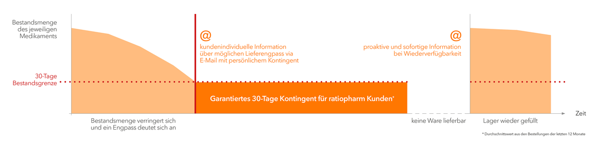 Klinikapotheken, die das betreffende Arzneimittel bei ratiopharm gekauft haben, wer den 30 Tage vor einem möglichen Lieferengpass kundenindividuell von ratiopharm informiert. Zugleich wird basierend auf dem Bedarf der Klinikapotheke in den letzten zwölf Monaten ein 30-Tage-Kontingent der Ware vorgehalten. Die Klinikapotheke hat somit die Möglichkeit interne Bestände abzugleichen und gegebenenfalls das Kontin gent innerhalb der nächsten 30 Tage abzurufen.