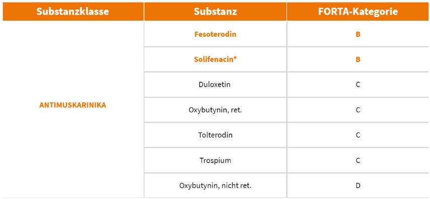 * Nicht mit in die Aktualisierung der Leitlinie aufgenommen wurde das Update der FORTA-Klassifikation im Jahr 2018, in dessen Rahmen auch Solifenacin der Kategorie B zugeordnet wurde.